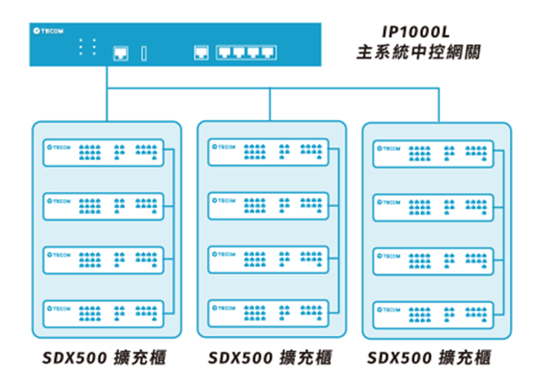 - 可透過IP網路,整合100套IP SDX500或東訊IP-KTS分站系統,組成跨域聯網系統。